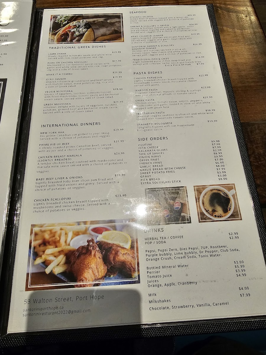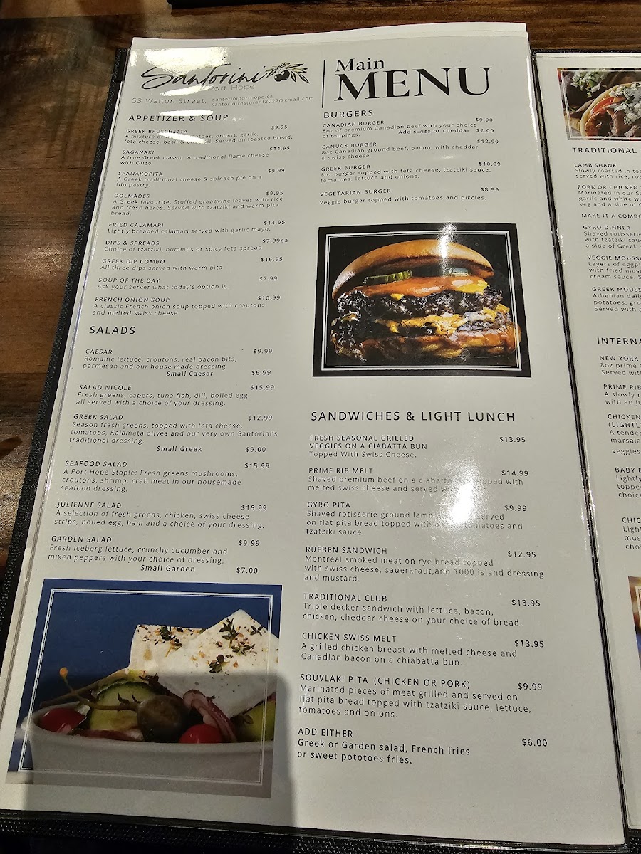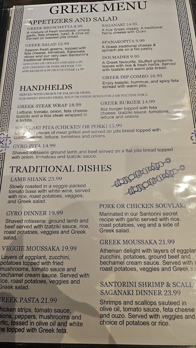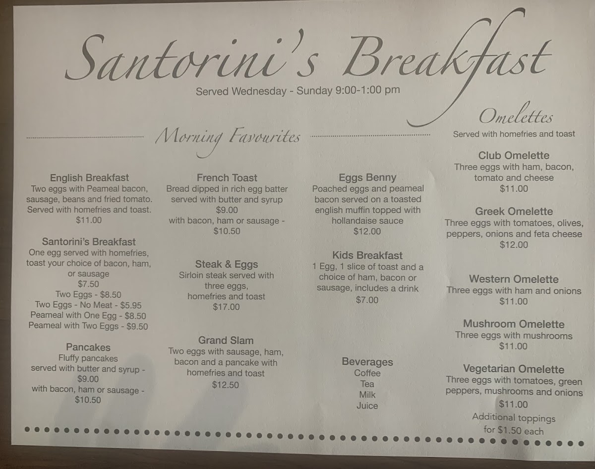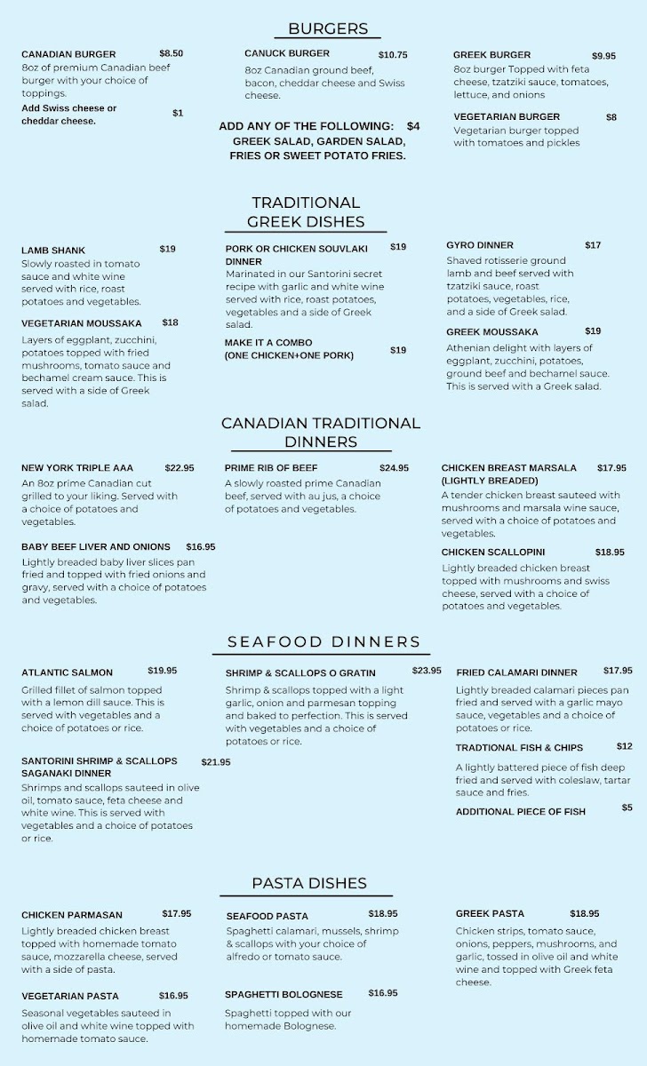 Santorini Restaurant offers a well-rounded menu that beautifully blends Mediterranean and classic comfort foods. Starting with breakfast, guests can enjoy the Greek Omelette and the English Breakfast, both options delivering hearty flavors to start the day. For lighter fare, their selection of Homemade Soups, including a rich Homemade Soup, complements the fresh and vibrant Greek Salad served either as a starter or entrée, alongside the Julienne Salad and the refreshing Seafood Salad. The sandwich and burger options are equally satisfying, with the standout being the Souvlaki Pita, a Mediterranean classic, and the hearty Canadian sandwich, with a side of crispy French Fries or a Side Salad. For dinner, the restaurant’s offerings include comforting yet elegant choices like the flavorful Chicken Parmigiana and the tender Beef Prime Rib, making for a satisfying end to any meal. The diversity of the menu ensures that there is something for everyone, whether you're in the mood for a light meal or a filling dinner.