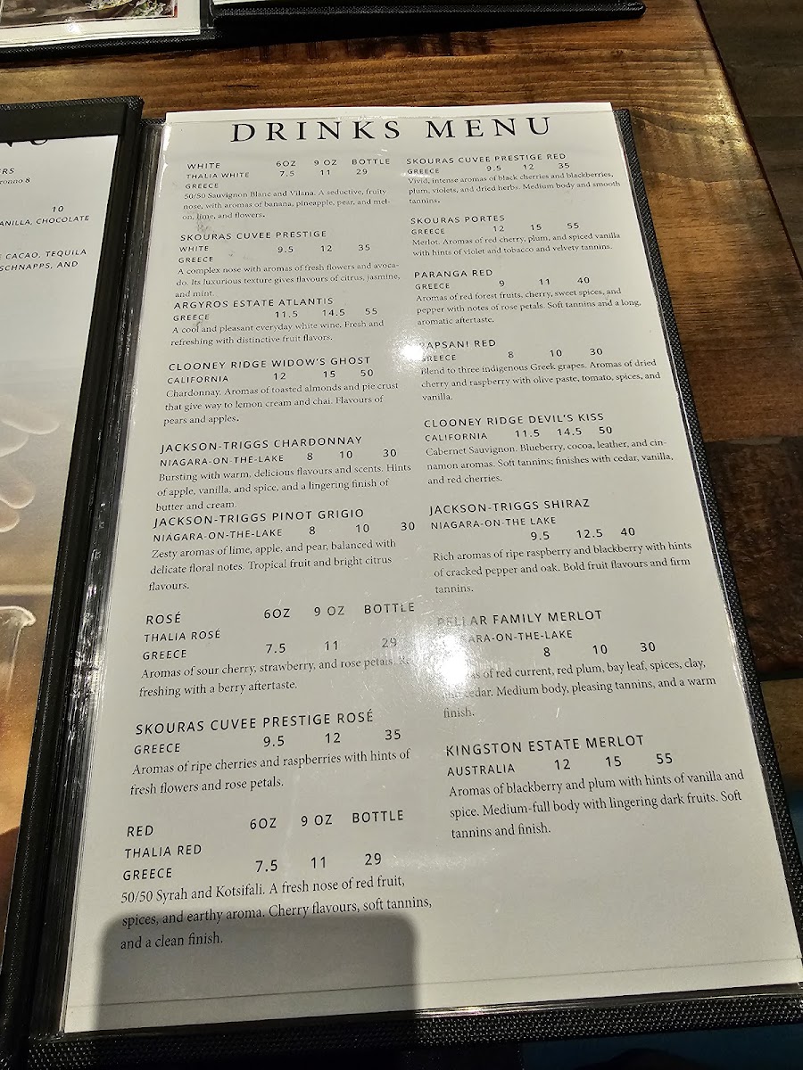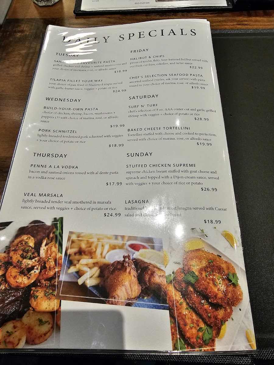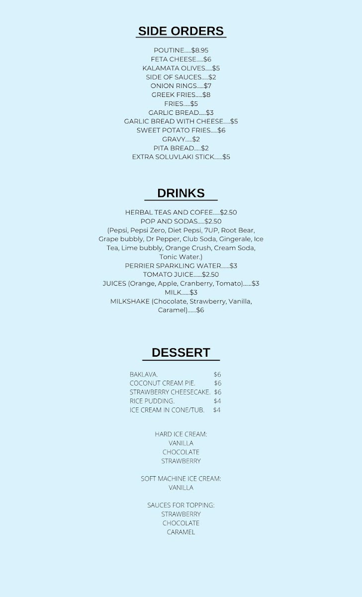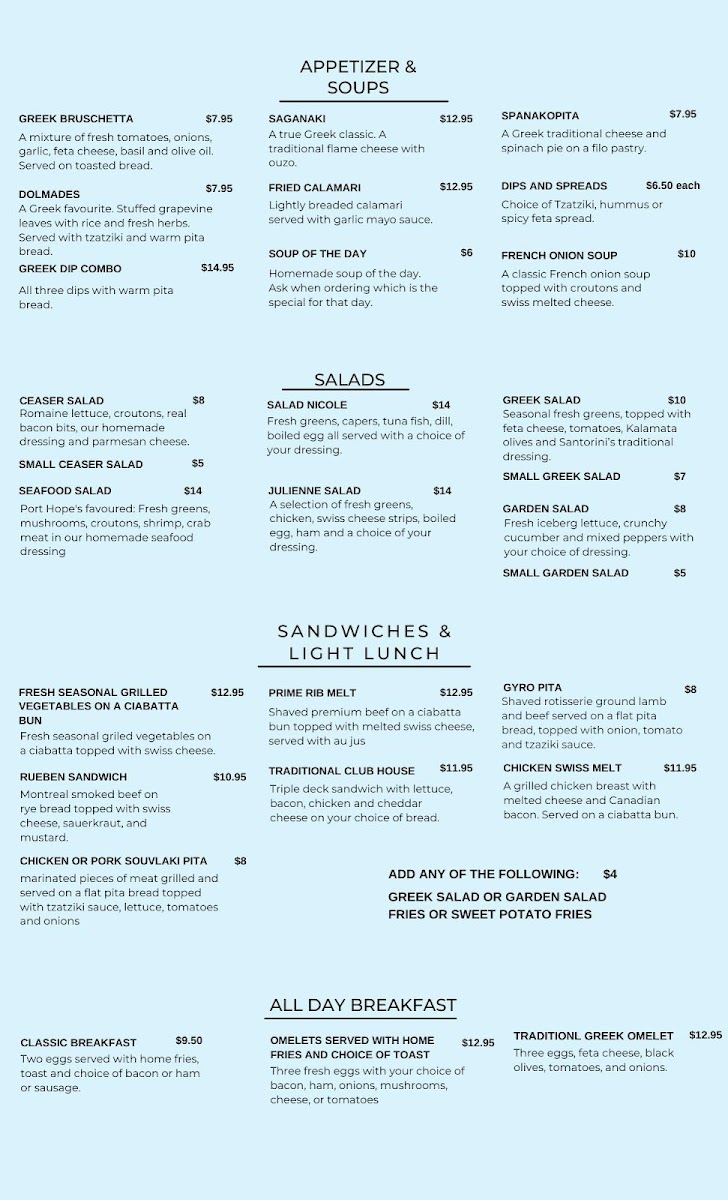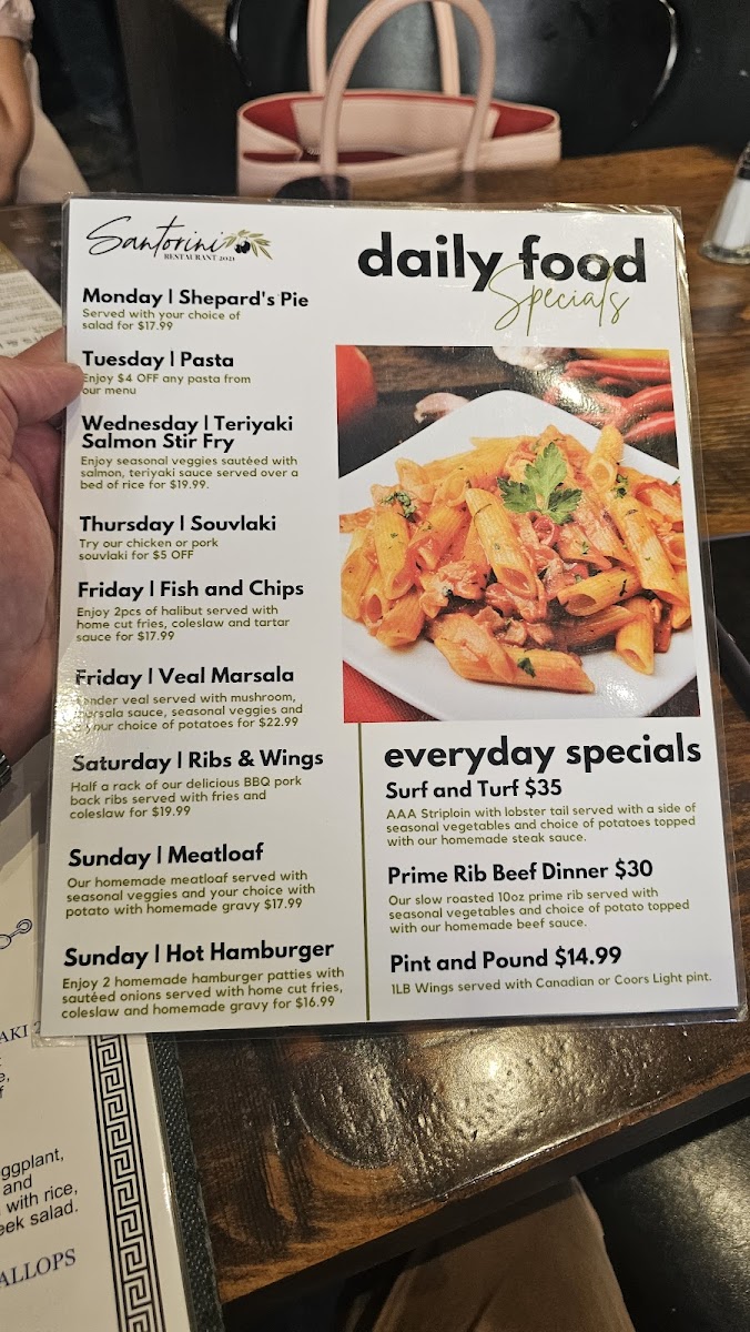 Santorini Restaurant offers a well-rounded menu that beautifully blends Mediterranean and classic comfort foods. Starting with breakfast, guests can enjoy the Greek Omelette and the English Breakfast, both options delivering hearty flavors to start the day. For lighter fare, their selection of Homemade Soups, including a rich Homemade Soup, complements the fresh and vibrant Greek Salad served either as a starter or entrée, alongside the Julienne Salad and the refreshing Seafood Salad. The sandwich and burger options are equally satisfying, with the standout being the Souvlaki Pita, a Mediterranean classic, and the hearty Canadian sandwich, with a side of crispy French Fries or a Side Salad. For dinner, the restaurant’s offerings include comforting yet elegant choices like the flavorful Chicken Parmigiana and the tender Beef Prime Rib, making for a satisfying end to any meal. The diversity of the menu ensures that there is something for everyone, whether you're in the mood for a light meal or a filling dinner.